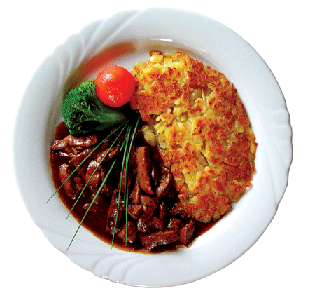 Jeweils Donnerstag (außer an Feiertagen) ab 18:00 Uhr - solange der Vorrat reicht - Suuri Leberle mit Röschti und gemischtem Beilagen-Salat € 9,50